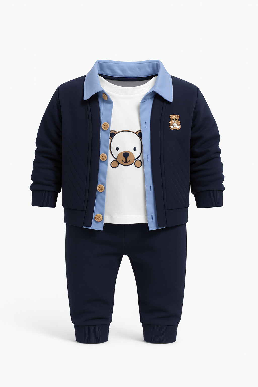 Este set de tres piezas combina estilo y comodidad para el día a día de tu bebé. Con una chaqueta de punto, una camiseta con estampado de osito y pantalones suaves, este conjunto es ideal para mantener a tu pequeño abrigado y a la moda. Disponible en combinaciones de azul marino y gris, este set versátil es perfecto para cualquier ocasión casual.