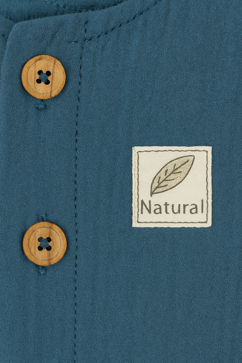 Con un cierre de botones frontales con detalles en madera, este enterizo es tanto práctico como estilizado. Su ajuste relajado permite total libertad de movimiento, ideal para jugar, salir de paseo o simplemente disfrutar del día con comodidad.
