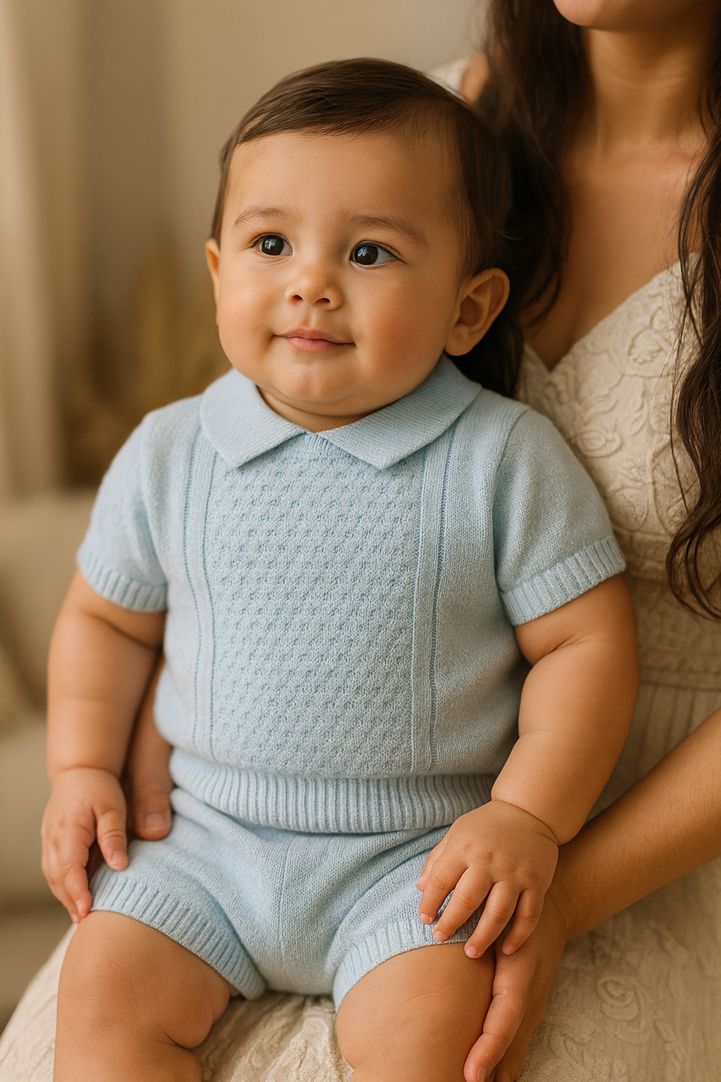 This elegant two-piece knit set is a timeless addition to your baby’s wardrobe. Featuring a short-sleeve collared top with delicate knit detailing and matching shorts, this outfit is perfect for keeping your little one comfortable and stylish. The soft light gray color adds a touch of sophistication, making it suitable for both everyday wear and special occasions.