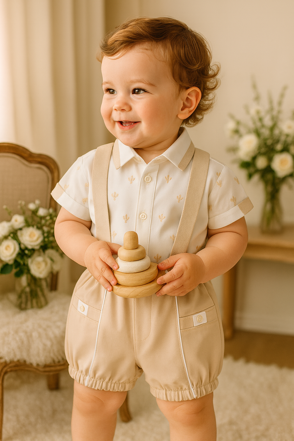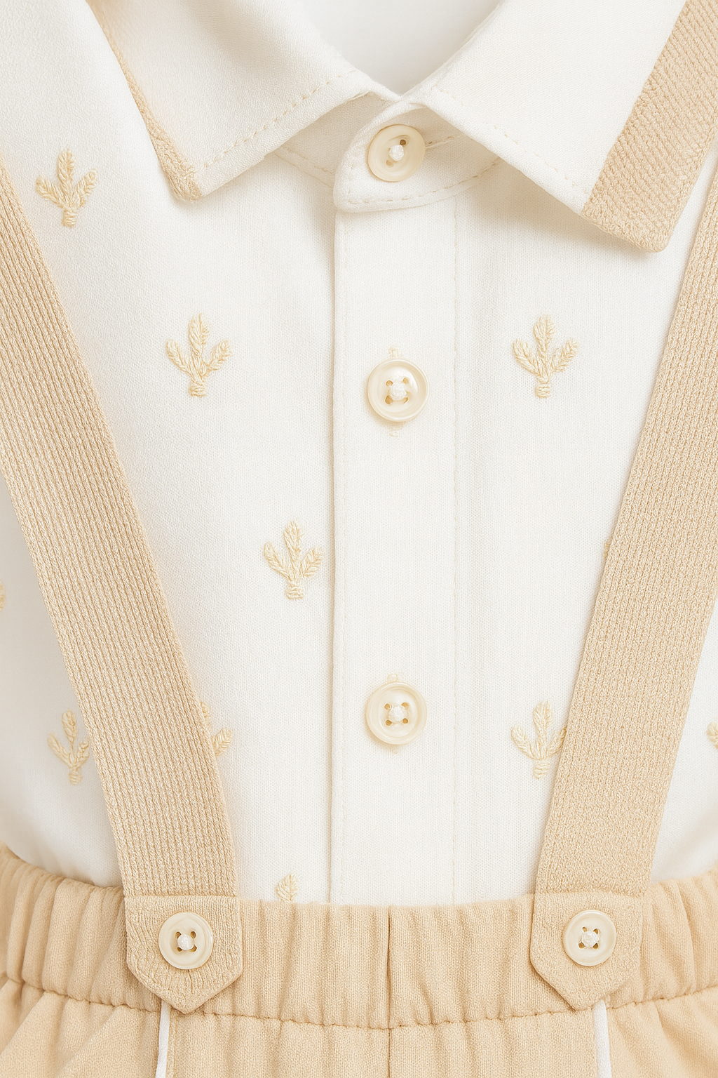 The matching suspender shorts add a touch of vintage charm with their soft elastic waistband and adorable button details. Whether for a special occasion or a stylish everyday look, this set keeps your little one comfy and looking adorable all day long!