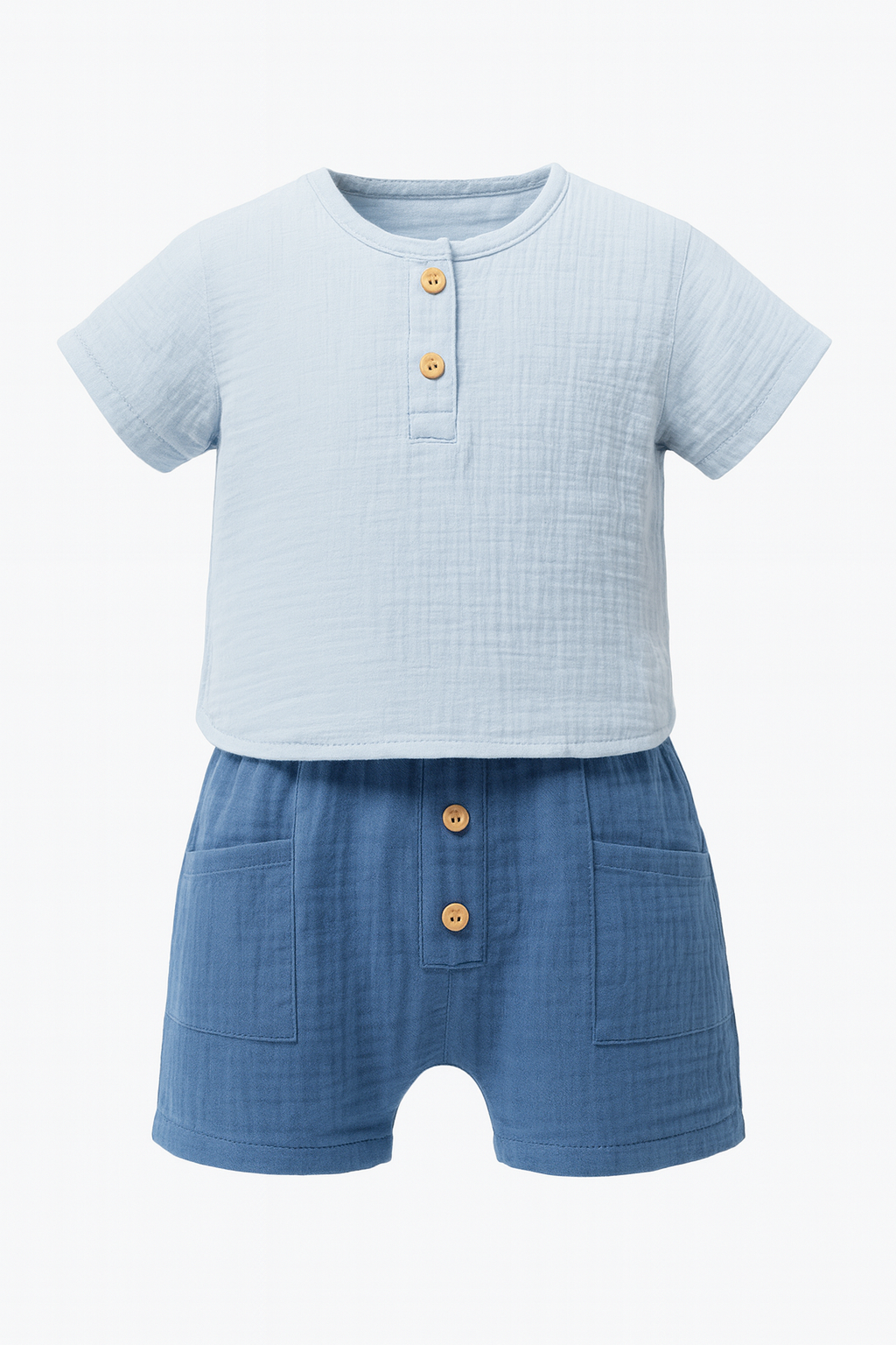 This charming set features a light blue short-sleeve top paired with natural blue shorts, complete with a covered elastic waistband for a comfortable and secure fit. Each piece is thoughtfully crafted to provide maximum comfort and ease of movement for your little explorer.