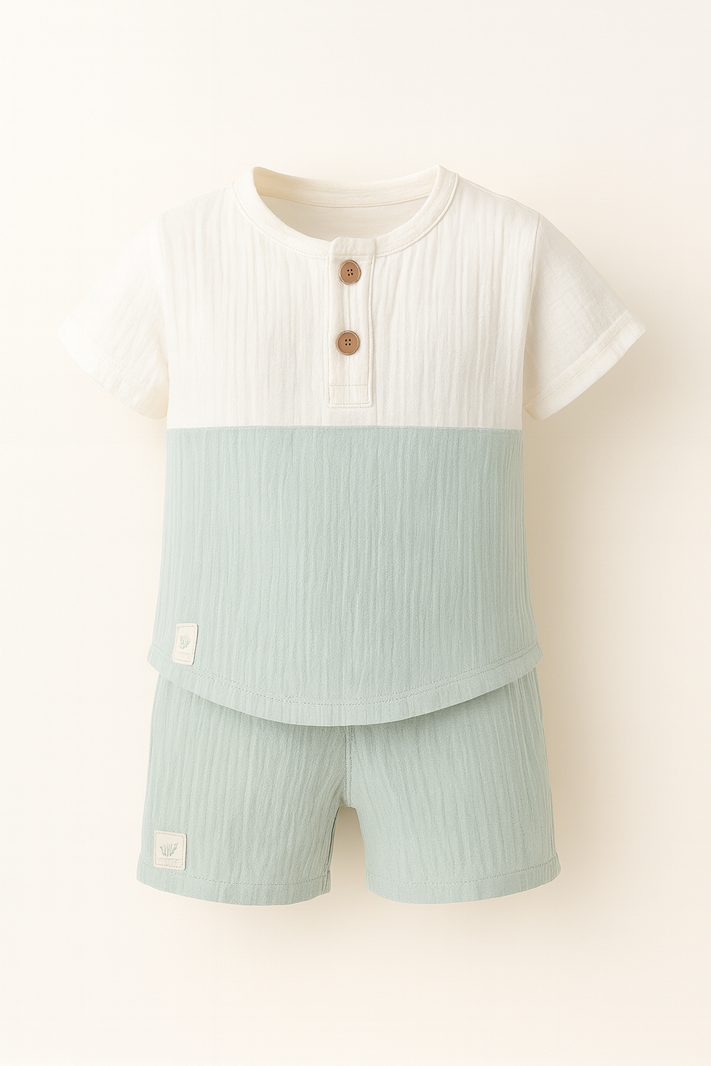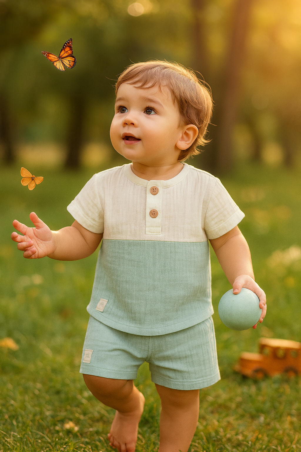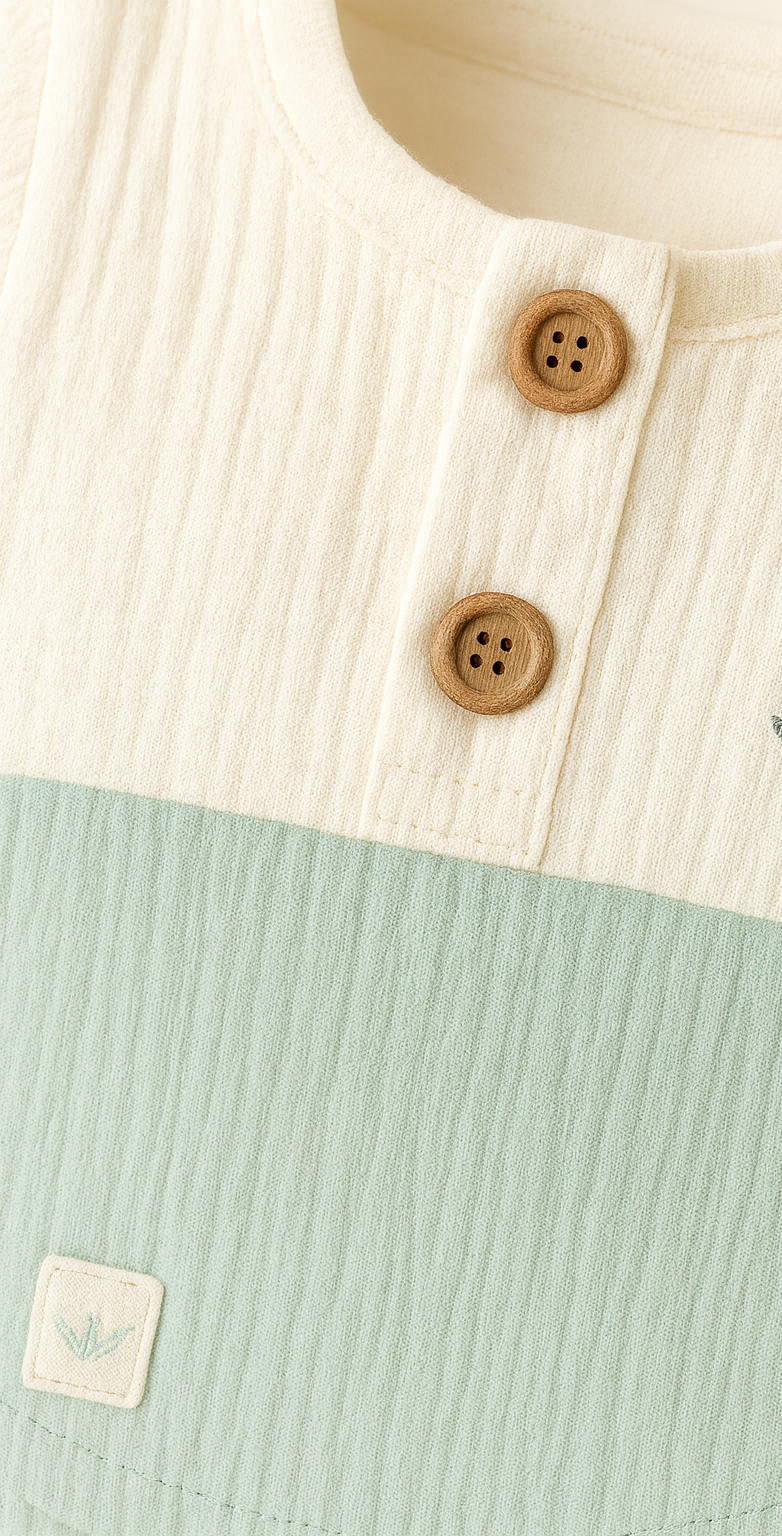 Pensado para pequeños aventureros con gran estilo, este conjunto de dos piezas ofrece un balance perfecto entre suavidad y sencillez. La camiseta presenta un diseño en bloques de color blanco y menta, con botones de madera que añaden un toque rústico encantador. Se complementa con pantaloncitos ajustables a juego en color menta, todo confeccionado en muselina de algodón transpirable, ideal para mantener a tu Pequeño Tesoro fresco y cómodo todo el día.