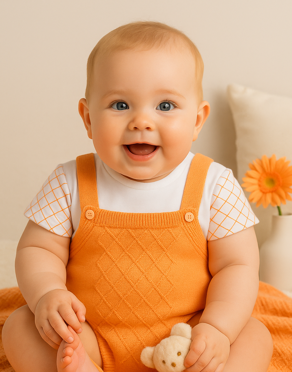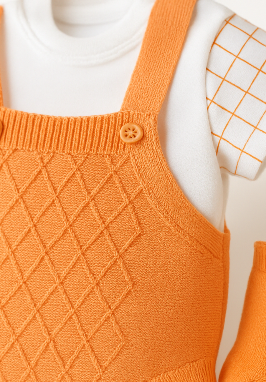 El conjunto de ranita tejida con tirantes es la combinación ideal de comodidad y estilo atemporal, diseñado para que tu pequeño tesoro luzca adorable y se sienta cómodo durante todo el día. Confeccionado en algodón tejido transpirable y ultra suave, este set incluye una ranita con tirantes y un delicado patrón de tejido en rombos, un bodysuit de manga corta con sutiles detalles de cuadros, y un par de medias tejidas a juego para completar el look con un toque de elegancia.