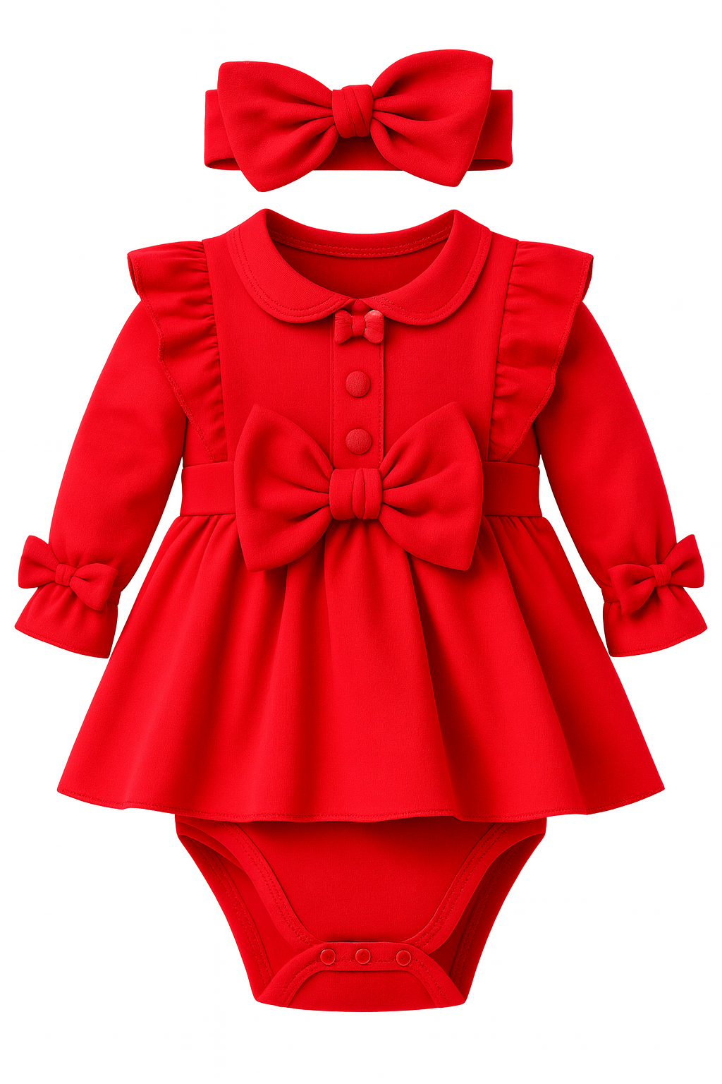 • Design: Red onesie with ruffled details on the shoulders and a large bow at the waist for a chic and playful look, paired with a matching headband.