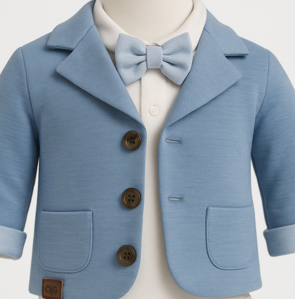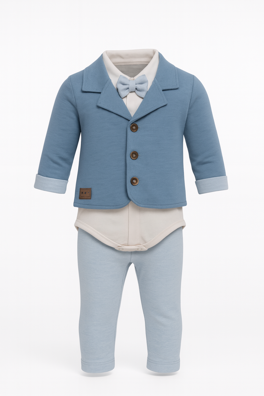 El set incluye un body crema con corbatín azul claro, una chaqueta estilo blazer en azul con botones decorativos y un pantalón de algodón a juego. Perfecto para ocasiones especiales, reuniones familiares o simplemente para vestir a tu pequeño caballerito con un estilo clásico y encantador.