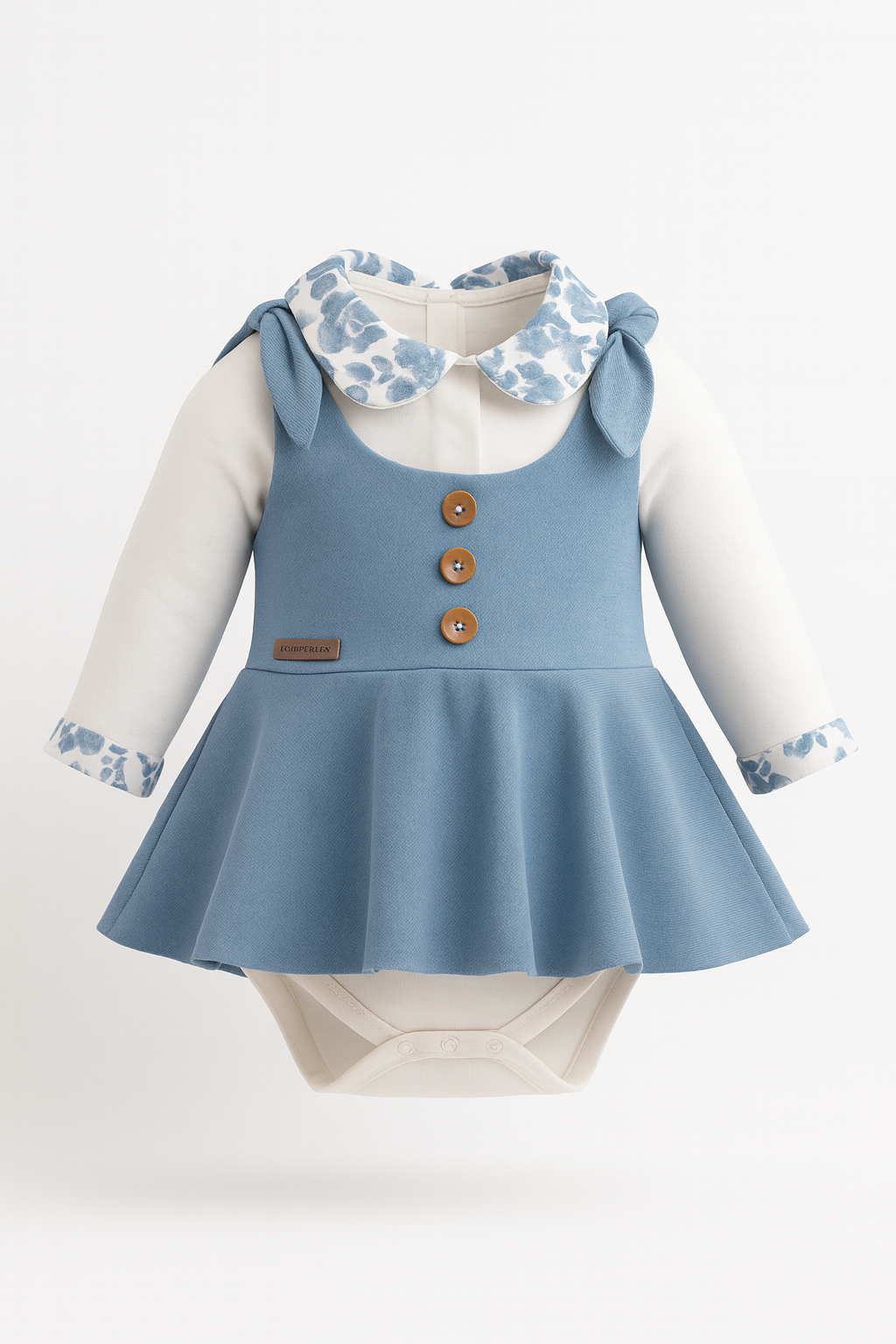 Incluye un body blanco de manga larga con cuello y puños estampados en flores azules, combinado con un sobrevestido azul estilo pichi con botones decorativos y lazos en los hombros, logrando un look lleno de ternura y sofisticación.