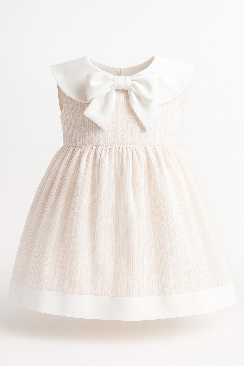 Featuring a classic A-line silhouette, delicate textured stripes, and a statement oversized bow at the neckline, this dress is perfect for special occasions, celebrations, or creating picture-perfect family memories.