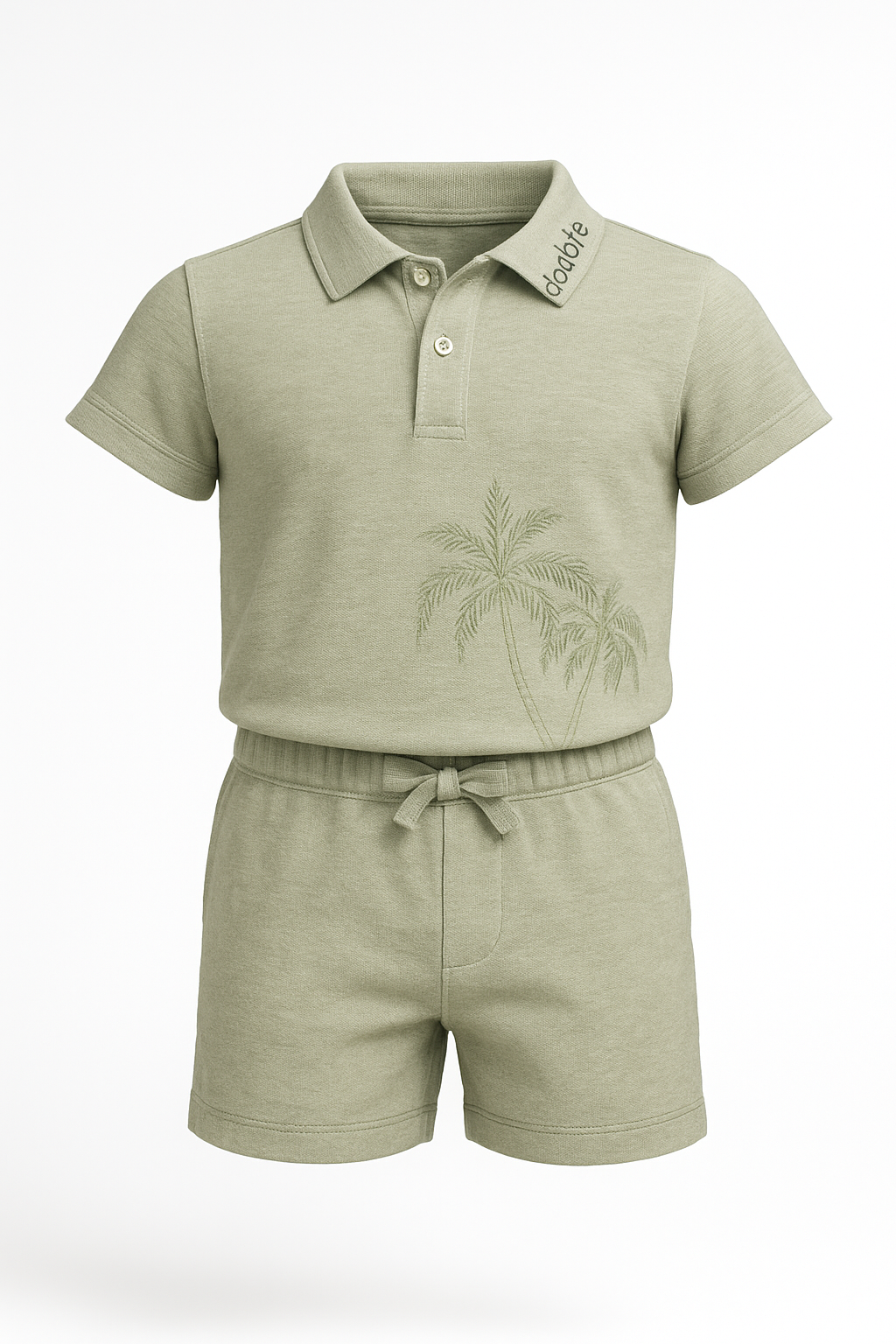 The set includes a short-sleeve polo shirt with a classic collar, palm tree embroidery, and matching shorts with an elastic waistband for extra comfort. A versatile and fresh design that keeps your little one cool and stylish all summer long.
