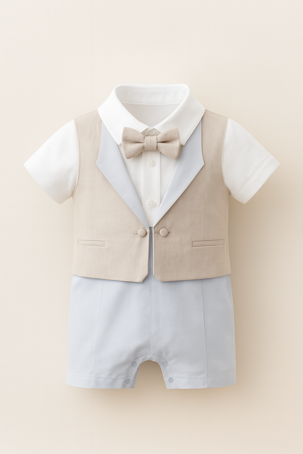 Incluye una camisa de manga corta con chaleco beige integrado, pajarita a juego y parte inferior en azul claro, creando un look perfecto para cumpleaños, bodas, bautizos o cualquier celebración especial. Los botones a presión en la parte inferior facilitan el cambio de ropa para los padres.