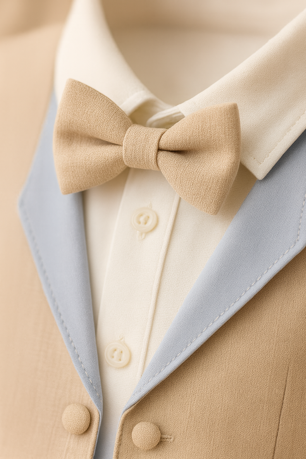 ✔ Details: Beige vest, matching bow tie, and light blue bottoms.