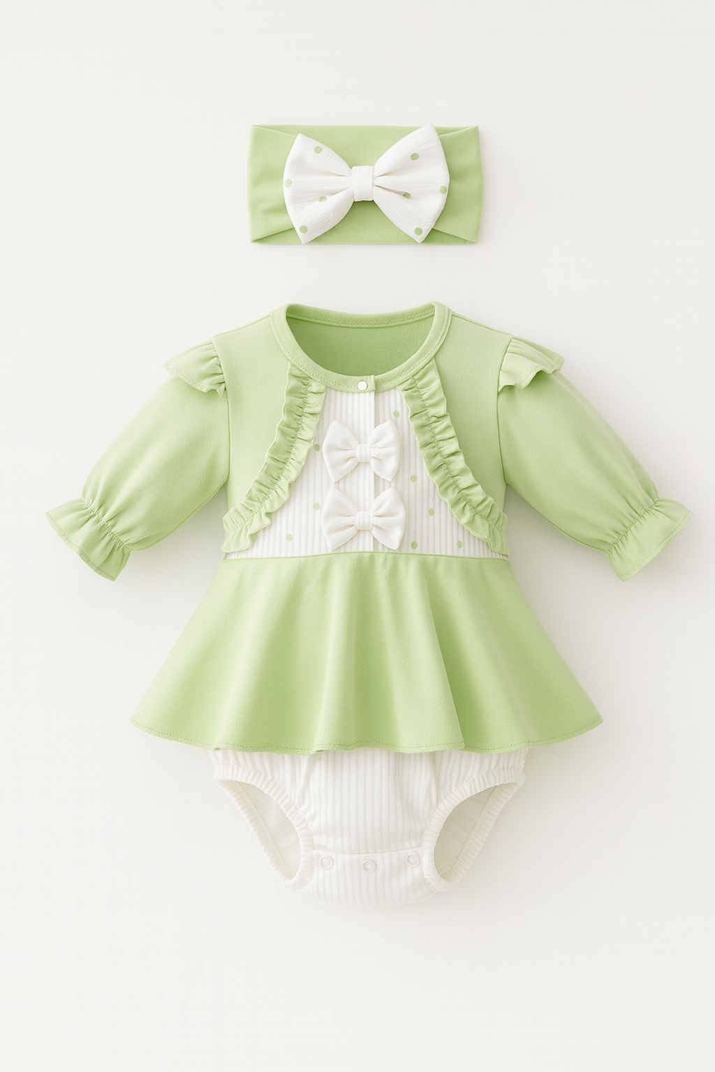Con su color refrescante y delicados detalles, este Set Bebé Lazos Verde Menta es perfecto para mantener a tu pequeño tesoro cómodo, elegante y lleno de ternura.