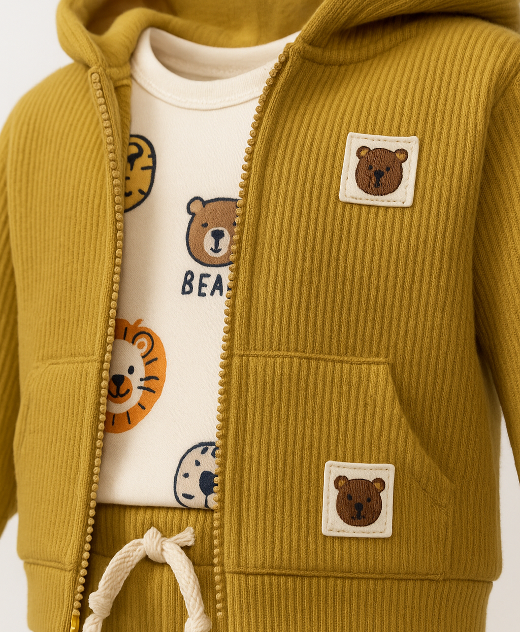 The set includes a zip-up hoodie with a little bear patch, matching jogger-style pants with a front pocket and bear detail, and a fun printed t-shirt to complete the look. This outfit is both cozy and stylish, making it ideal for everyday adventures or casual outings.