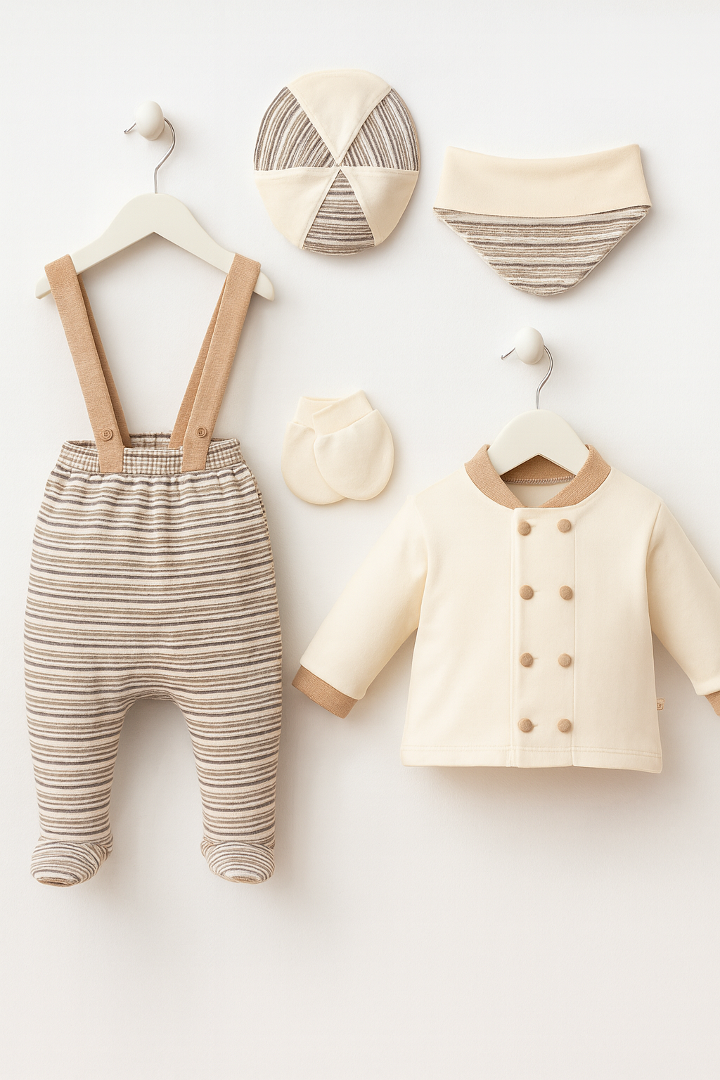Este set de 5 piezas incluye pantalón con tirantes y pies integrados en rayas, chaqueta crema cruzada con puños en contraste, gorro a juego, babero y mitones. Sus tonos neutros y diseño refinado lo convierten en la opción ideal para fotos de recién nacido, ocasiones especiales o como un regalo inolvidable.