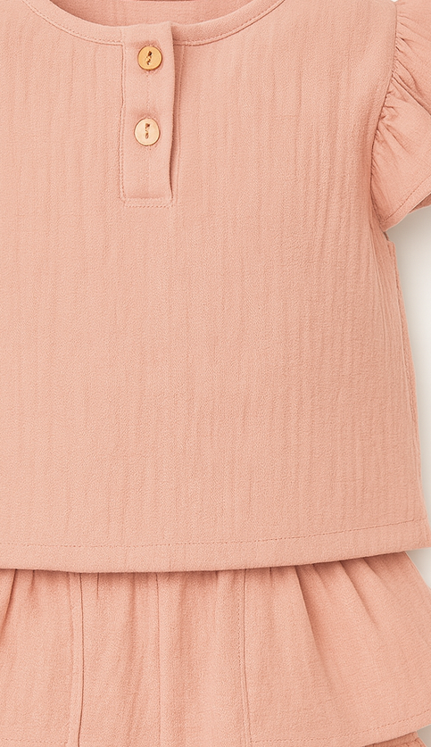 The outfit includes a ruffle-sleeve top with wooden-style buttons at the neckline, paired with matching layered shorts that add movement and a playful touch. A chic and practical ensemble for everyday wear or special outings.