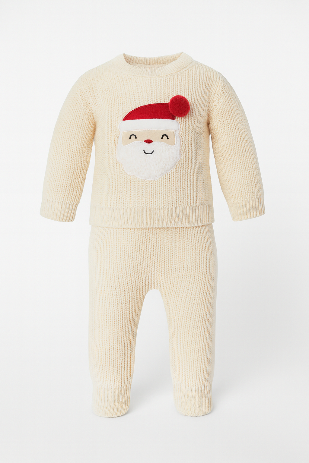 Este adorable set navideño es perfecto para mantener a tu bebé abrigado y lleno de espíritu festivo. El suéter rojo de punto presenta un divertido diseño de Santa Claus en relieve, completo con un pequeño pompón en su gorro. Los pantalones en color crema complementan el look de manera suave y elegante, haciendo de este conjunto una elección ideal para las celebraciones de la temporada.