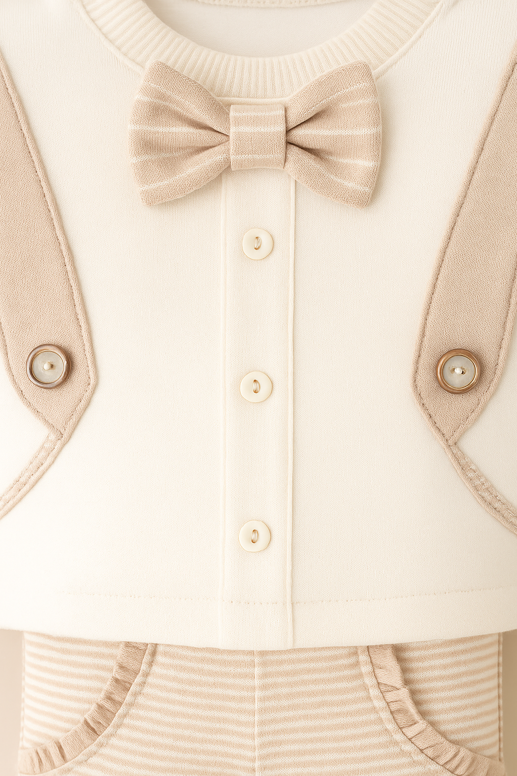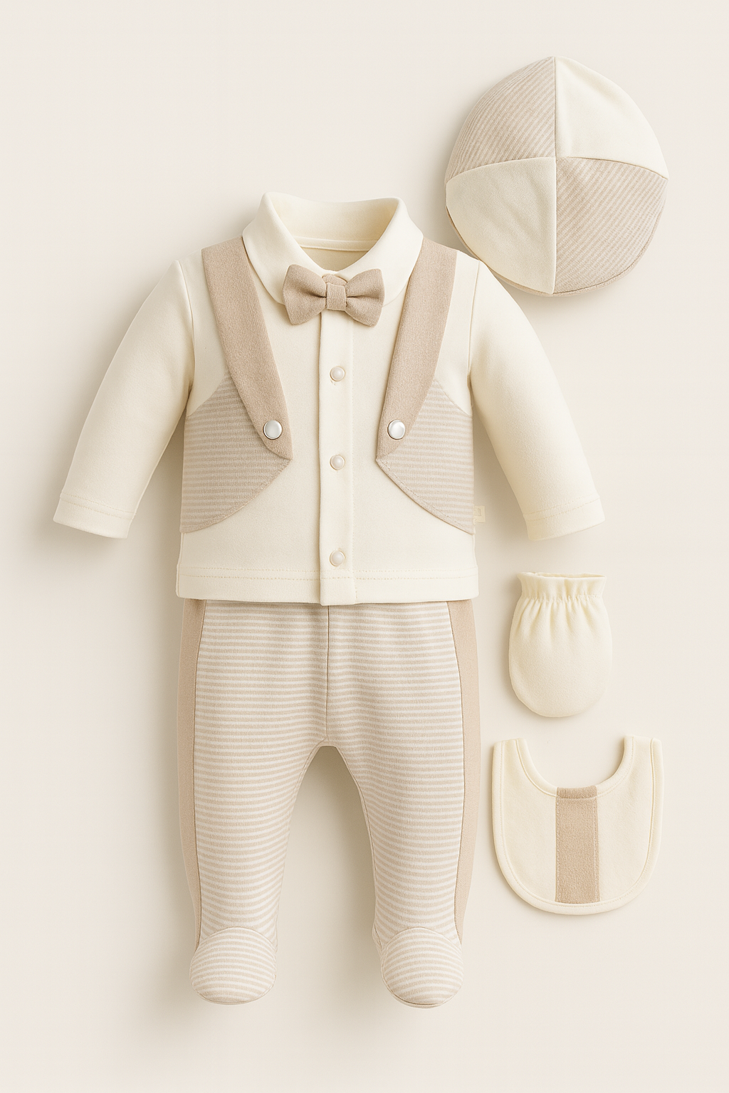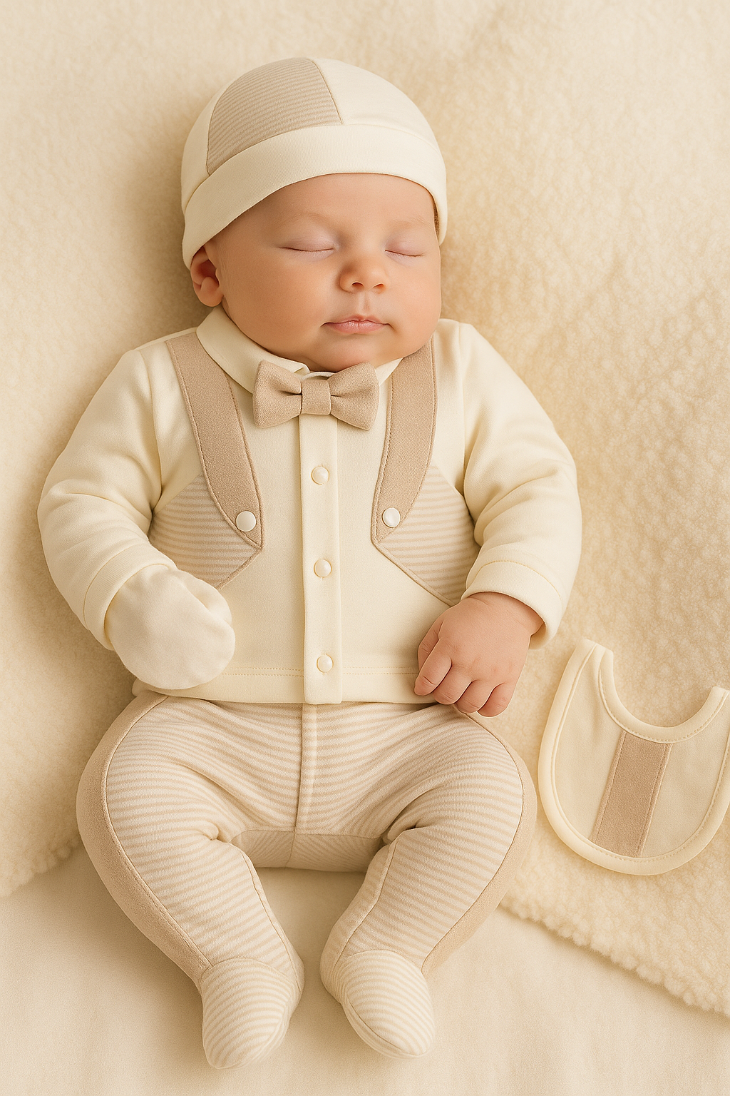 El set incluye una camiseta de manga larga con corbatín y detalles de chaleco simulado, pantalón con pies a juego, gorrito de rayas, babero con acentos beige y un par de manoplas. Perfecto para ocasiones especiales, reuniones familiares o simplemente para vestir a tu bebé con refinada comodidad.
