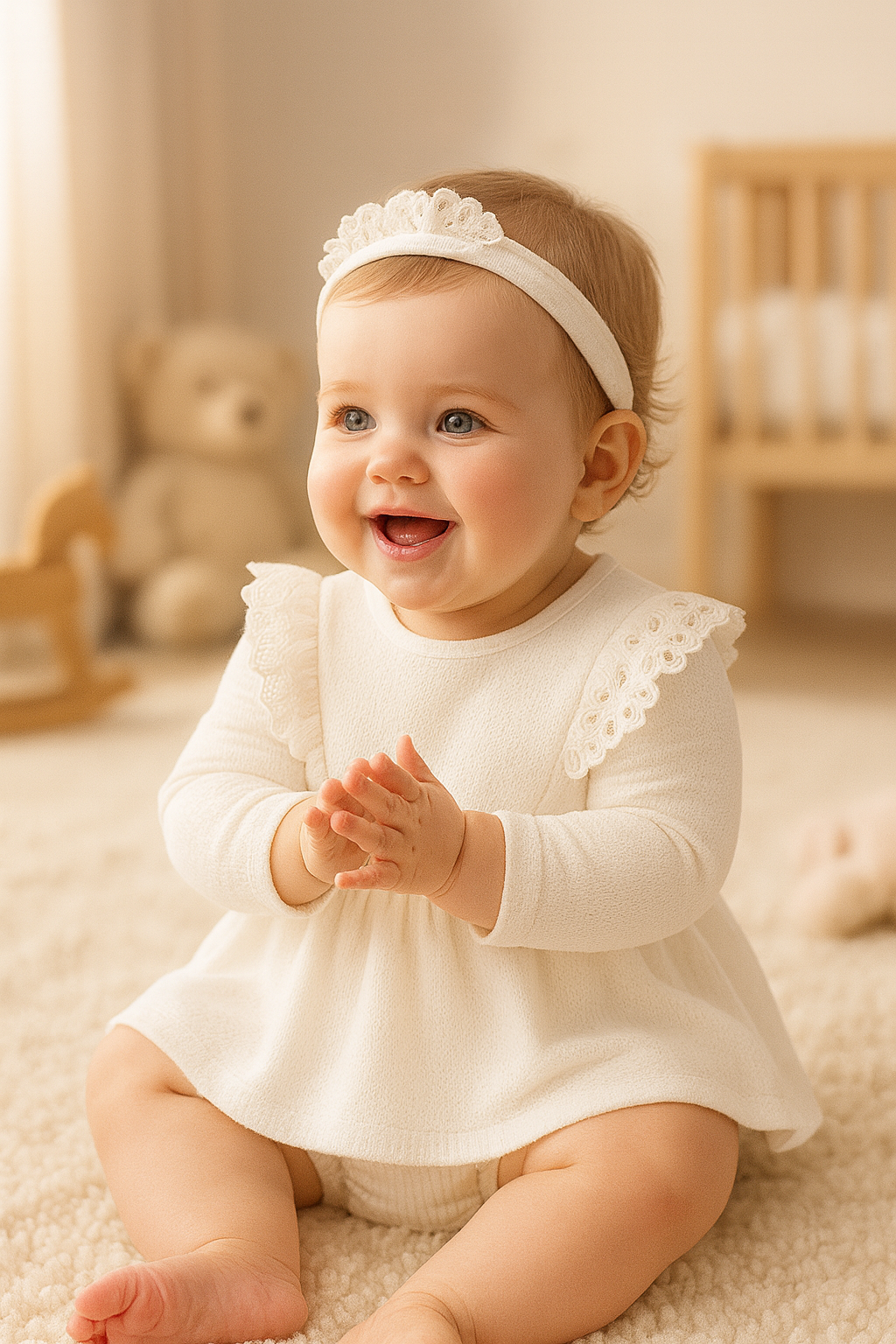Featuring long sleeves, delicate lace ruffles on the shoulders, and a charming skirt design, this set is completed with a matching lace headband — the perfect finishing touch for your baby’s look. Ideal for special occasions, family gatherings, or simply capturing picture-perfect moments.